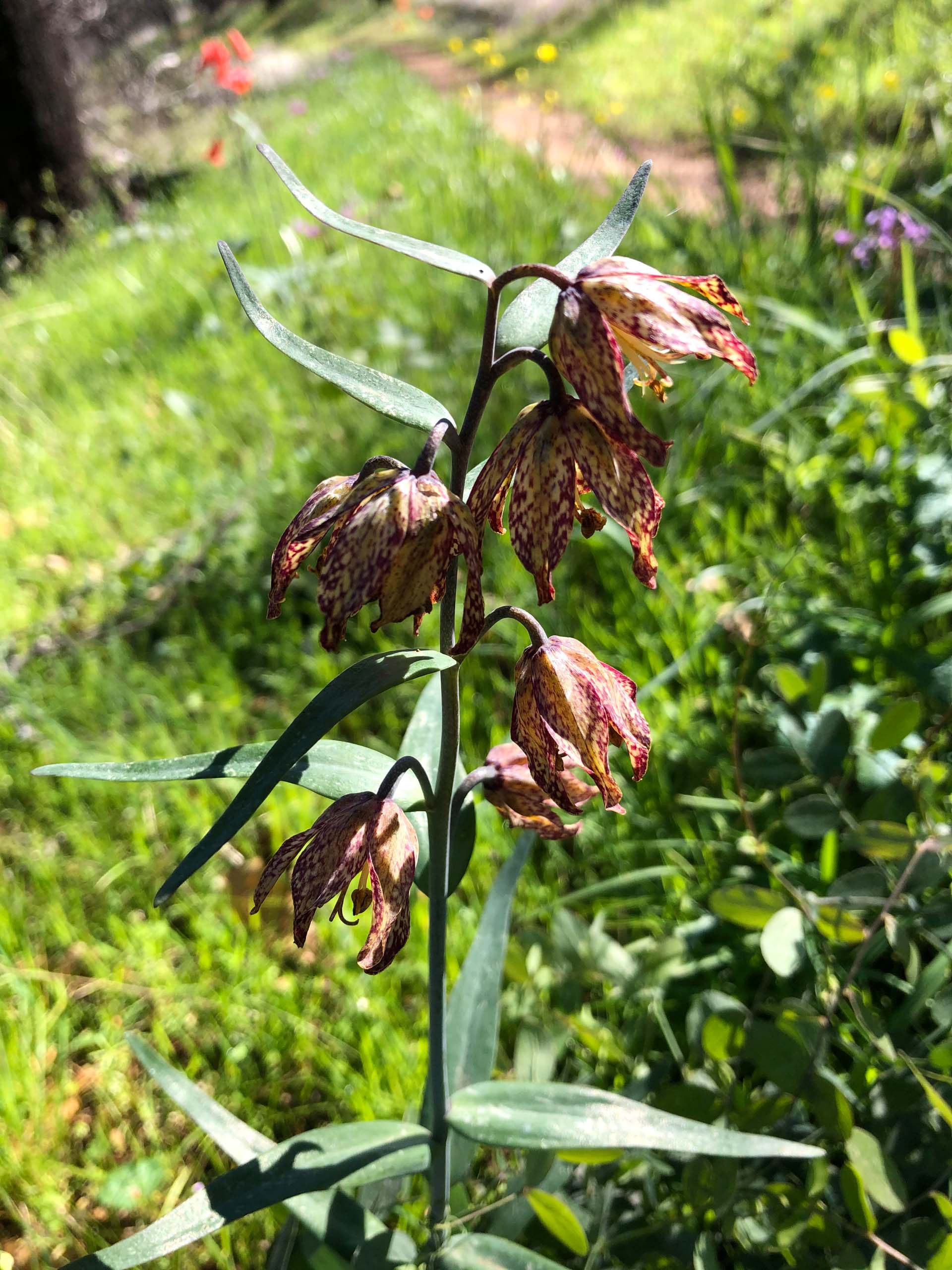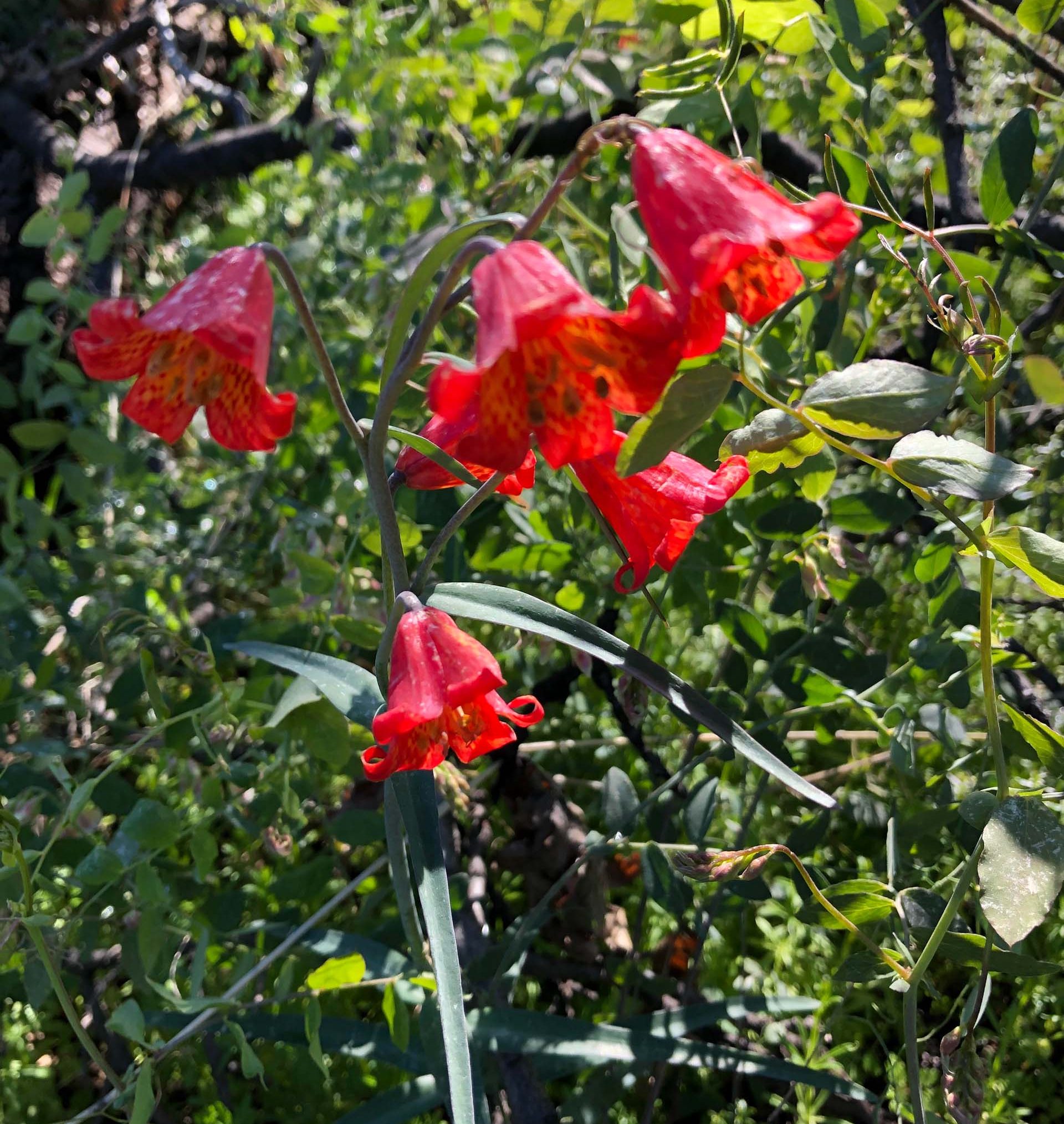 Some of the flowers I saw (and remember) were Henderson’s shooting stars, hound’s-tongue, Pacific sanicle, scarlet fritillaries, blue dicks, pussy ears, snub peas, chocolate lilies (Fritillaria affinis), common lomatium, showy phlox, purple sanicle, sky lupine, silver lupine, and western redbud.