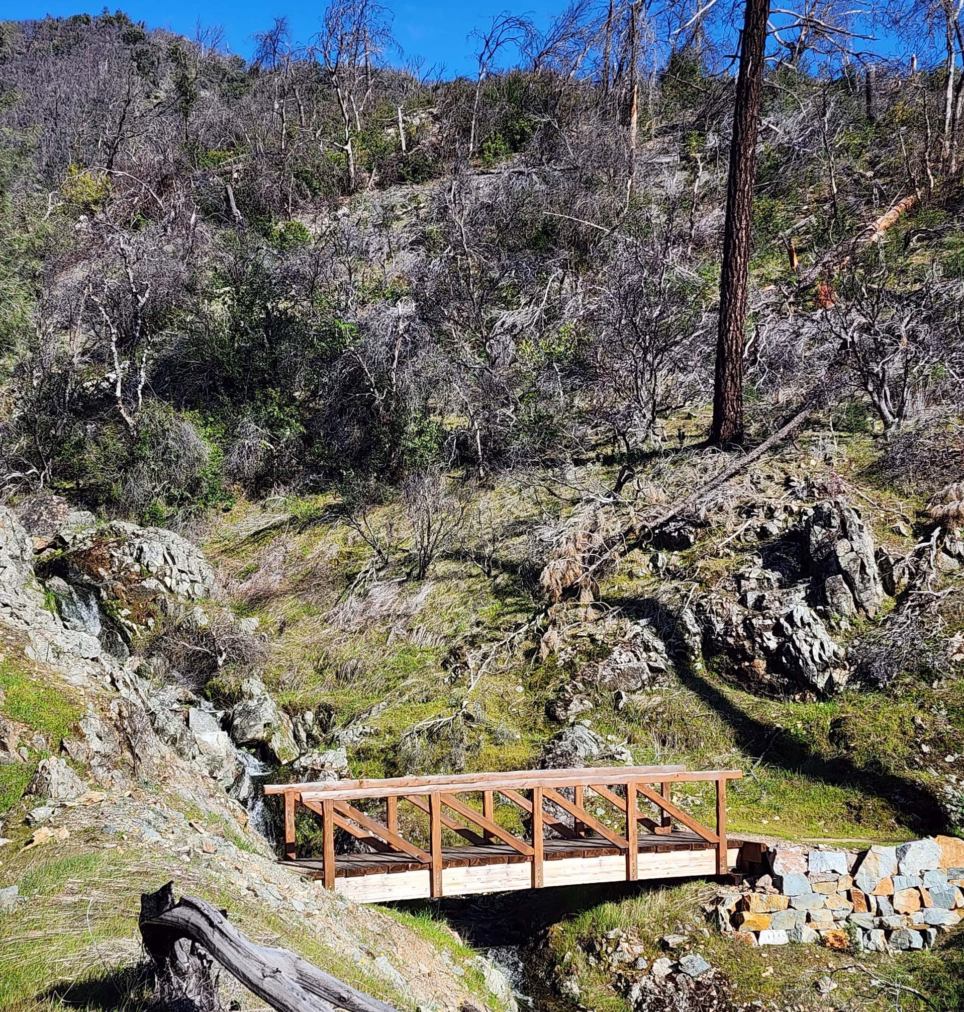 And there are few better places to see the diversity of springtime blooms than on the Princess Ditch Trail. Stoney Gulch Trailhead is the middle of three trailheads that provide access to the Princess Ditch Trail. Driving north on Mule Mountain Road, it is located just after the pavement ends. This is where we started our hike. We went north on the Princess Ditch Trail to Salt Creek Trailhead and back again for an ~9.0-mile hike. Princess Ditch Trail is primarily a very flat trail—most of the footbed is literally inside or on top of an old ditch. Several well-made wooden bridges span the numerous little creeks, which were all rushing, some with beautiful waterfalls, when we were there. The only difficulty is that, because it’s a ditch, it does still hold water after rains, but we have always found it pretty easy to get around. The only slopes you’ll find on this segment are those going to and from the trailheads to access the Princess Ditch Trail, and they are fairly short stretches.