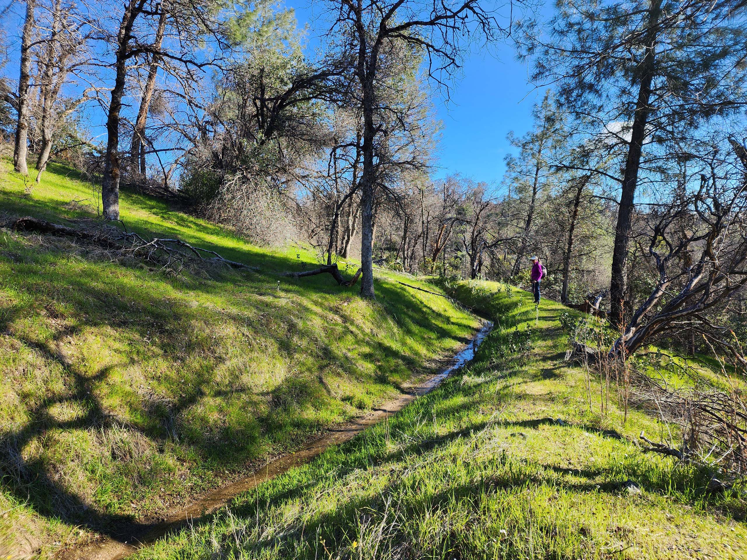 The day we hiked the northern ~4.5-mile section of the Princess Ditch Trail, in Redding’s Swasey Recreation Area, the weather was typical for an early-spring day. In the course of six hours, we experienced humid heat, chilly winds, rainy sunshine, hail, heavy overcast, and bright blue skies.