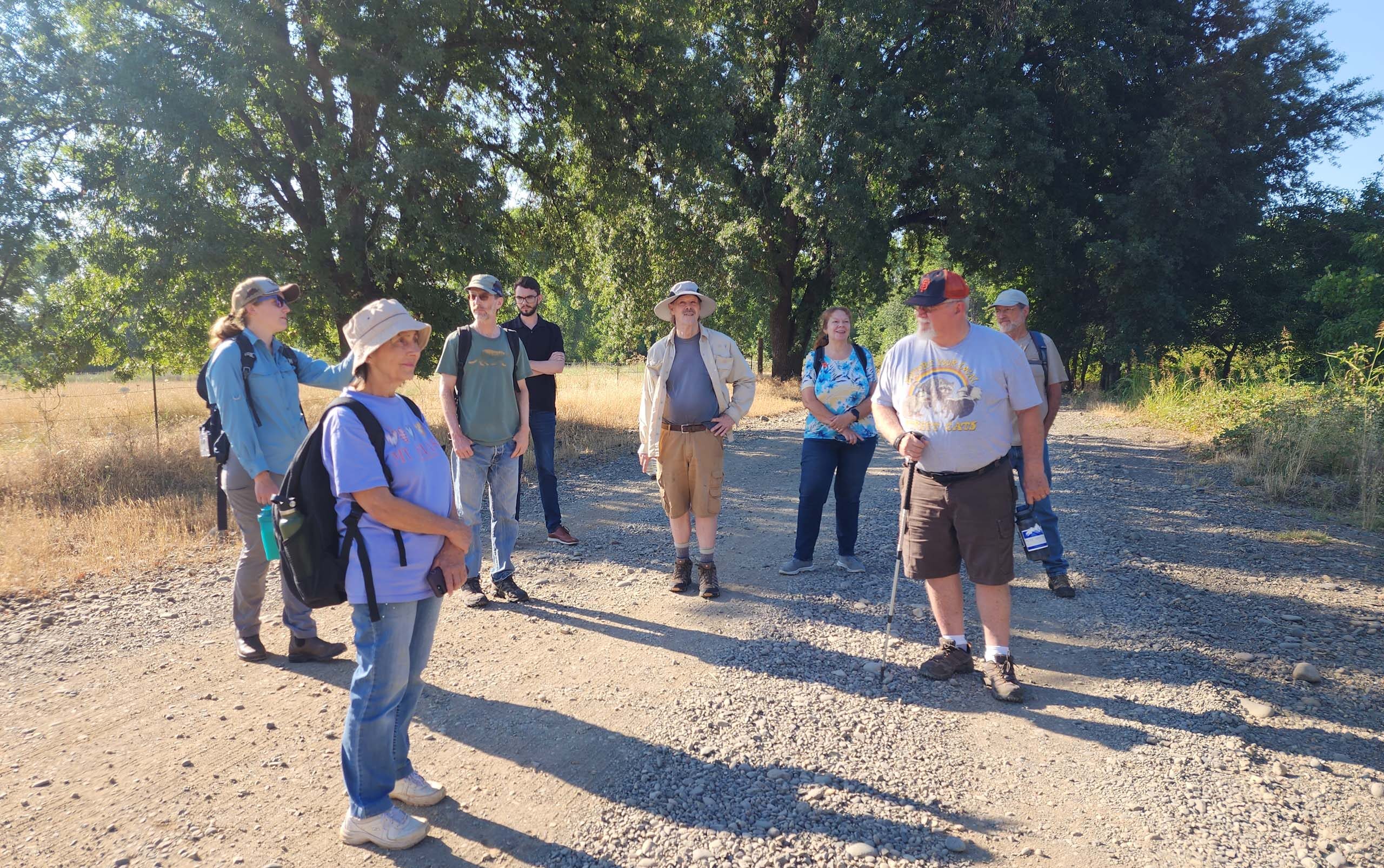 Despite the predicted hot, 109-degree high for the day, we had nine people show up for a tour of Bureau of Land Management’s (BLM) restoration site, Rancho Breisgau Unit, on the Sacramento River near Battle Creek, on Saturday, July 1. We started at 8 AM and ended at 10:30 AM, so we didn’t get too hot, but it was already 91 degrees when we finished.
