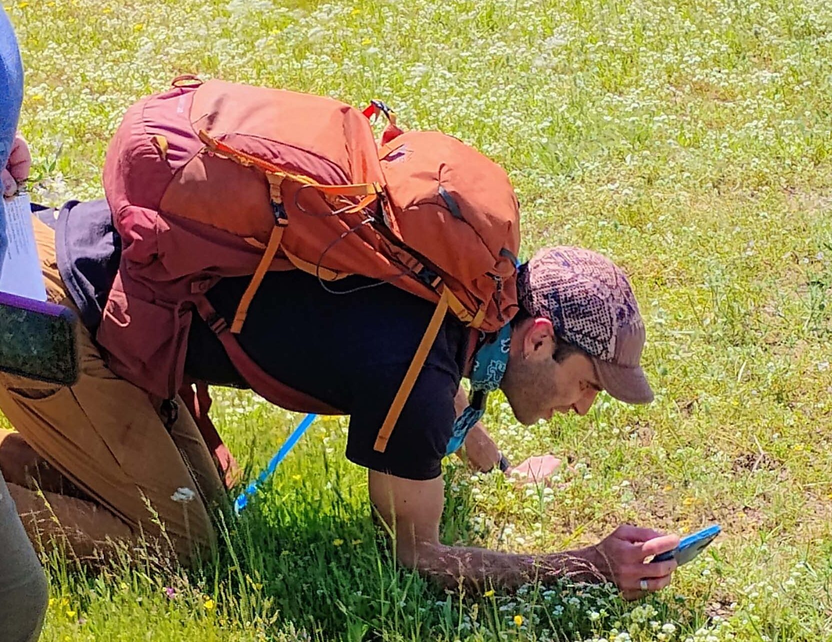 Christian Schwarz demonstrates his technique for photographing the most itty-bitty vernal pool denizens, on the May 4, 2025, field trip to see vernal-pool wildflowers in Redding. Photo © David Ledger.