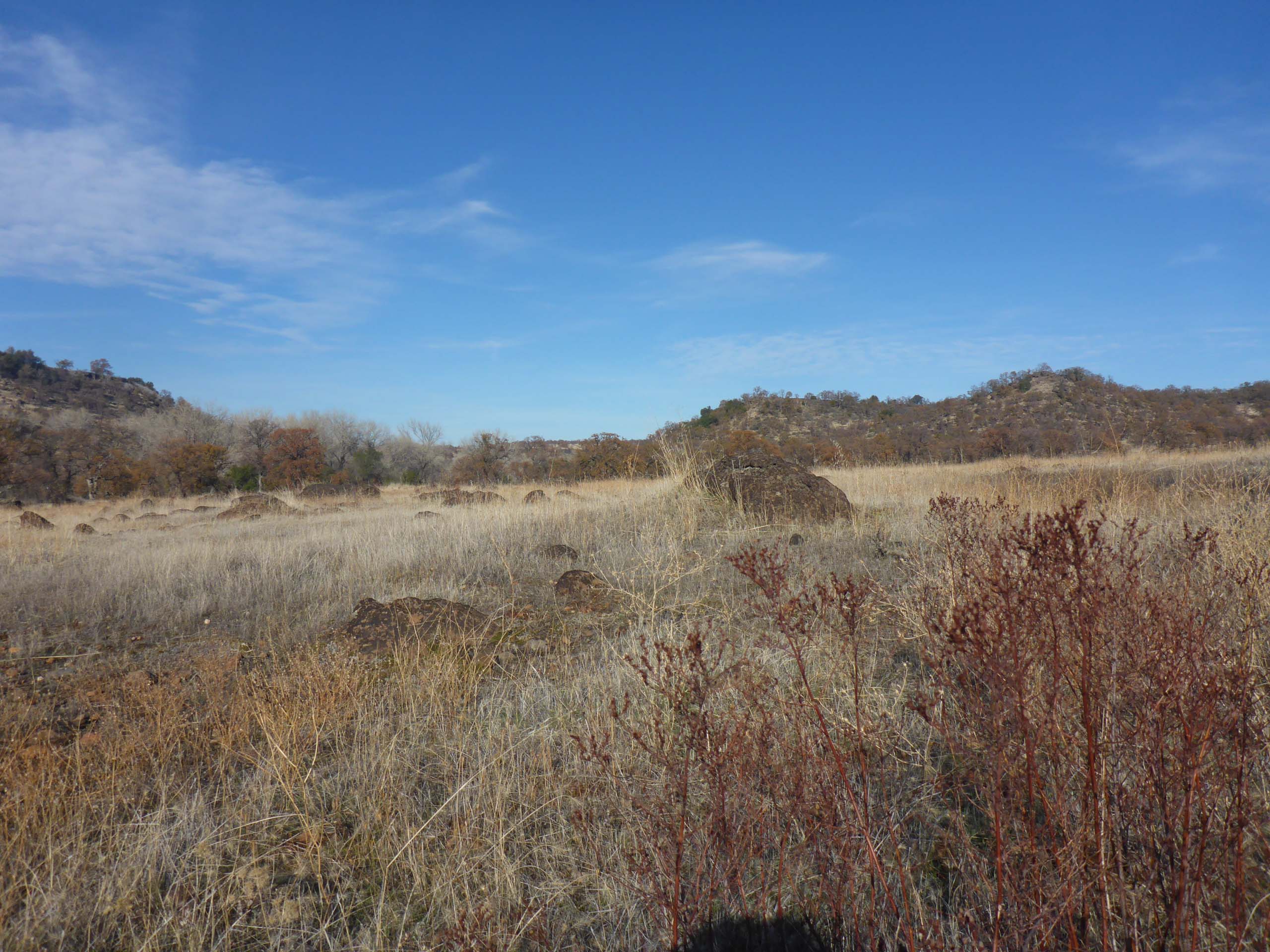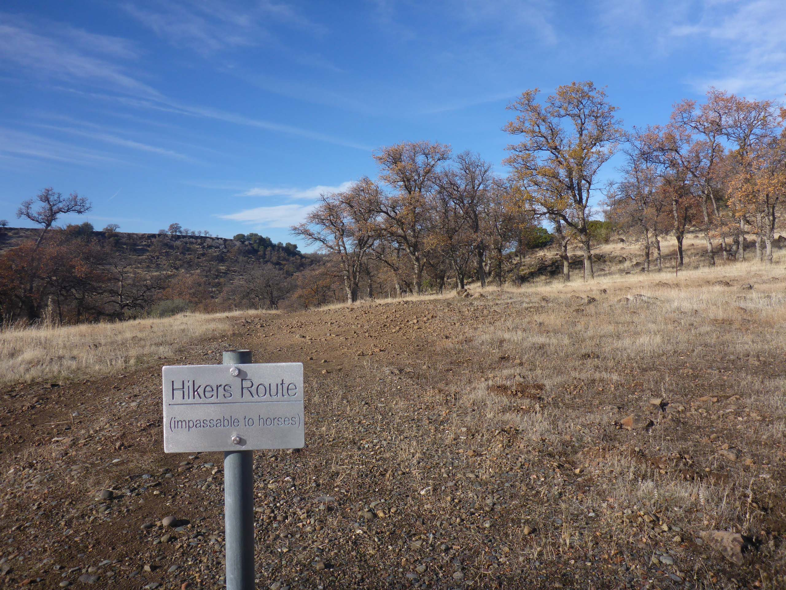 The left-hand trail will take you to Massacre Flat along a riparian route very close to the water’s edge. The right-hand loop will also get you to Massacre Flat, but this route is quite circuitous and is much longer. This longer route facilitates horseback riders, but both trails are highly recommended for hikers. To get to the promontory, however, go through a gate in the fence just to the right of where the trail splits, and hike the abandoned and rutted, unmaintained road that wraps up and around a little hill.