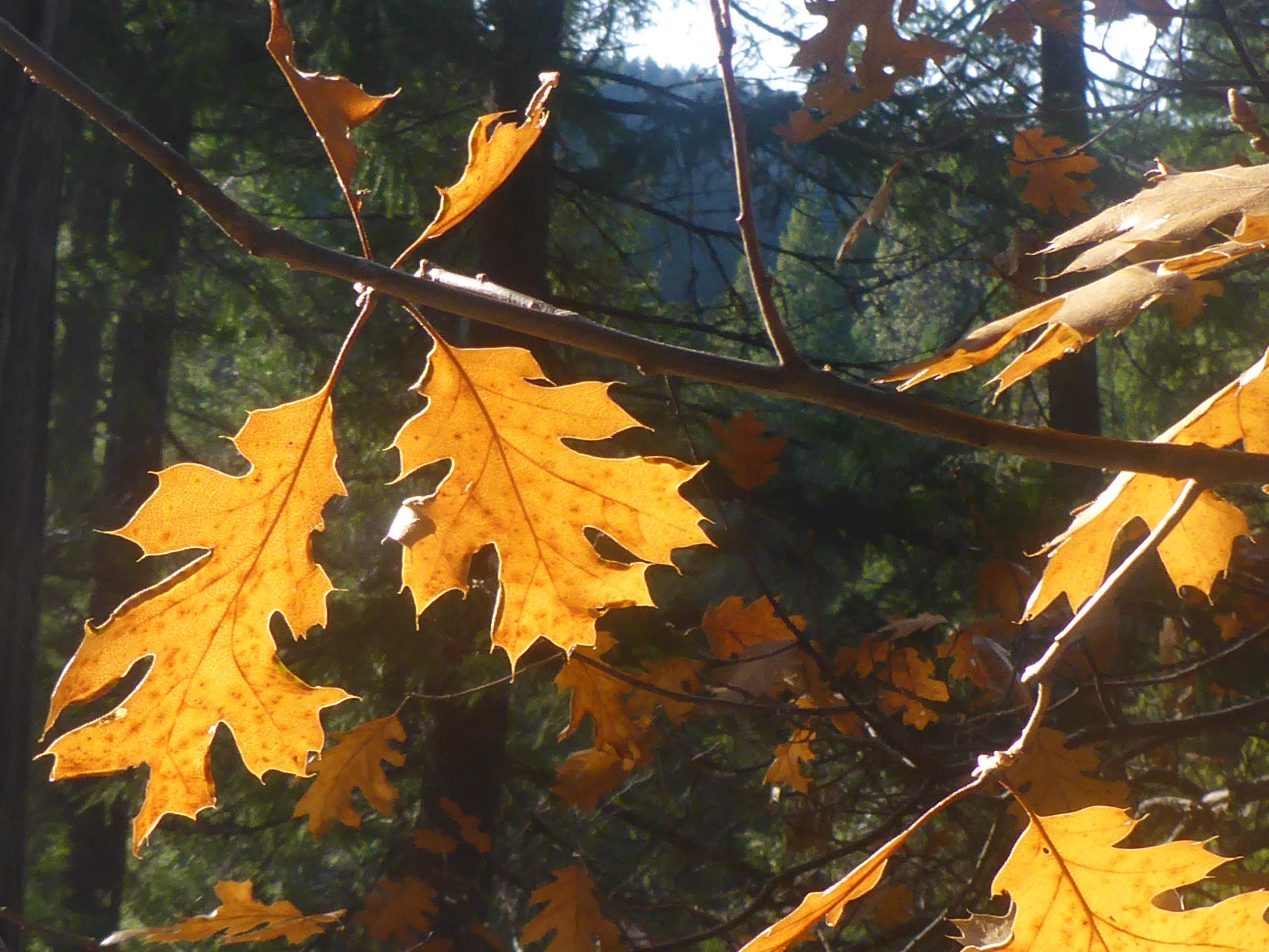 Here and there we found a few black oaks, Quercus kelloggii, with a few leaves still hanging on. Stuart Fork Trail, Trinity Alps. November 29, 2020. Photo by Don Burk.