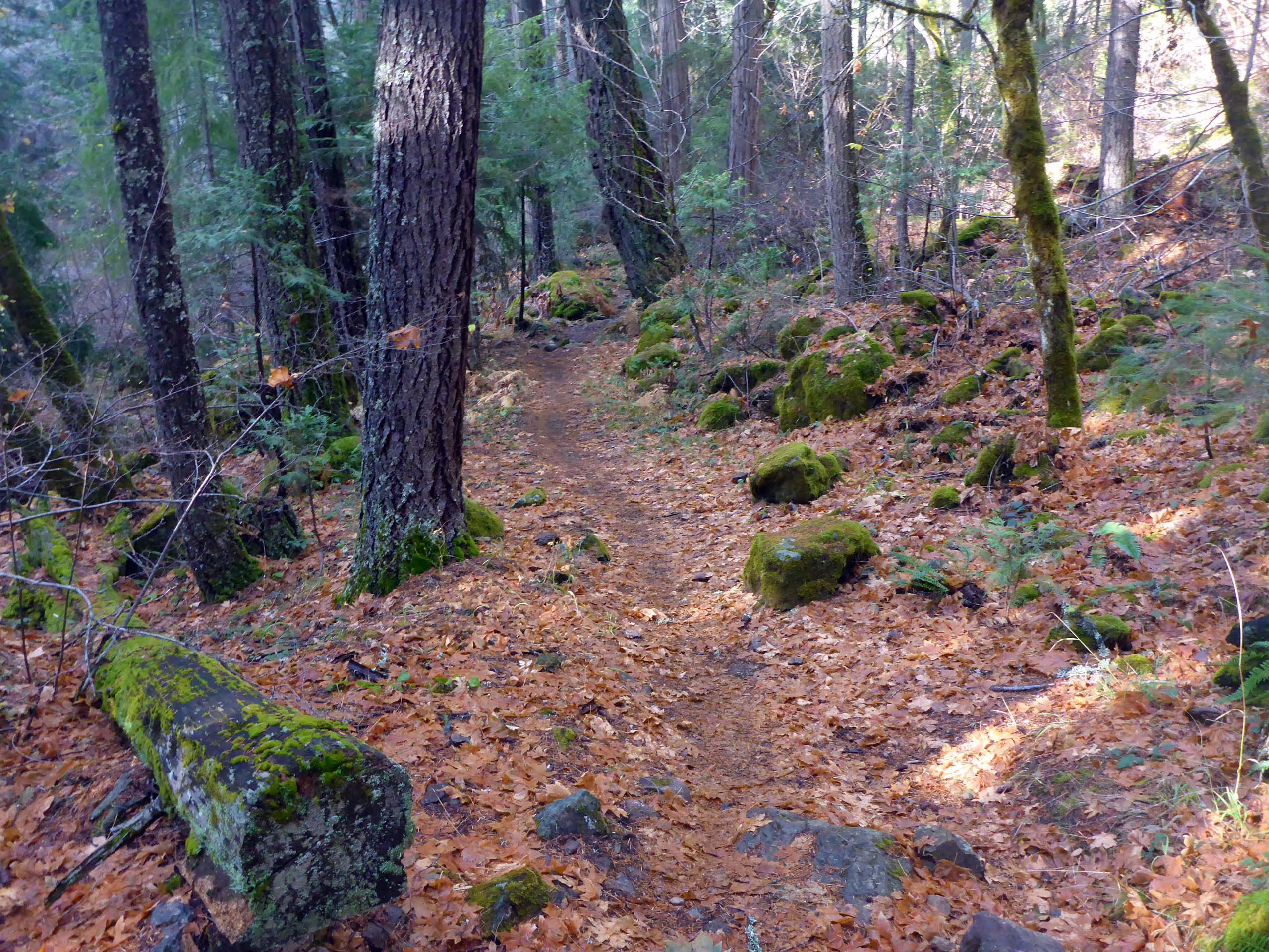 Stuart Fork Trail between the trailhead and Boulder Creek Trail mostly gradually ascends through mixed conifer–hardwood forest like this. November 29, 2020. Photo by Don Burk.