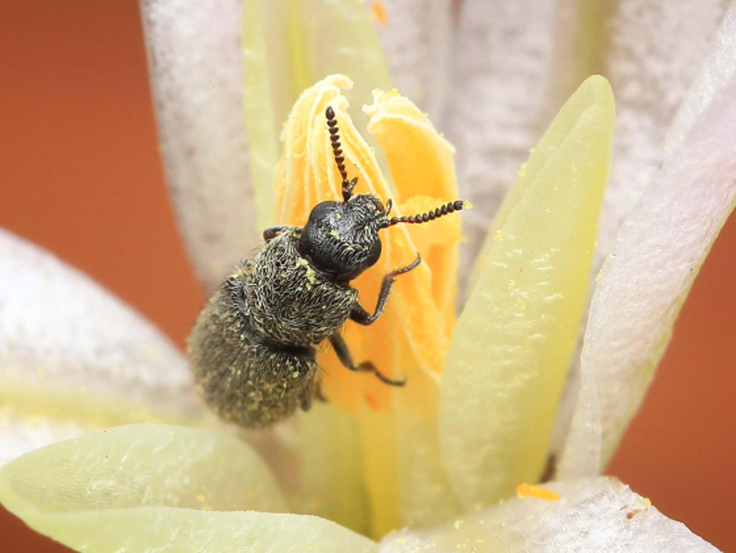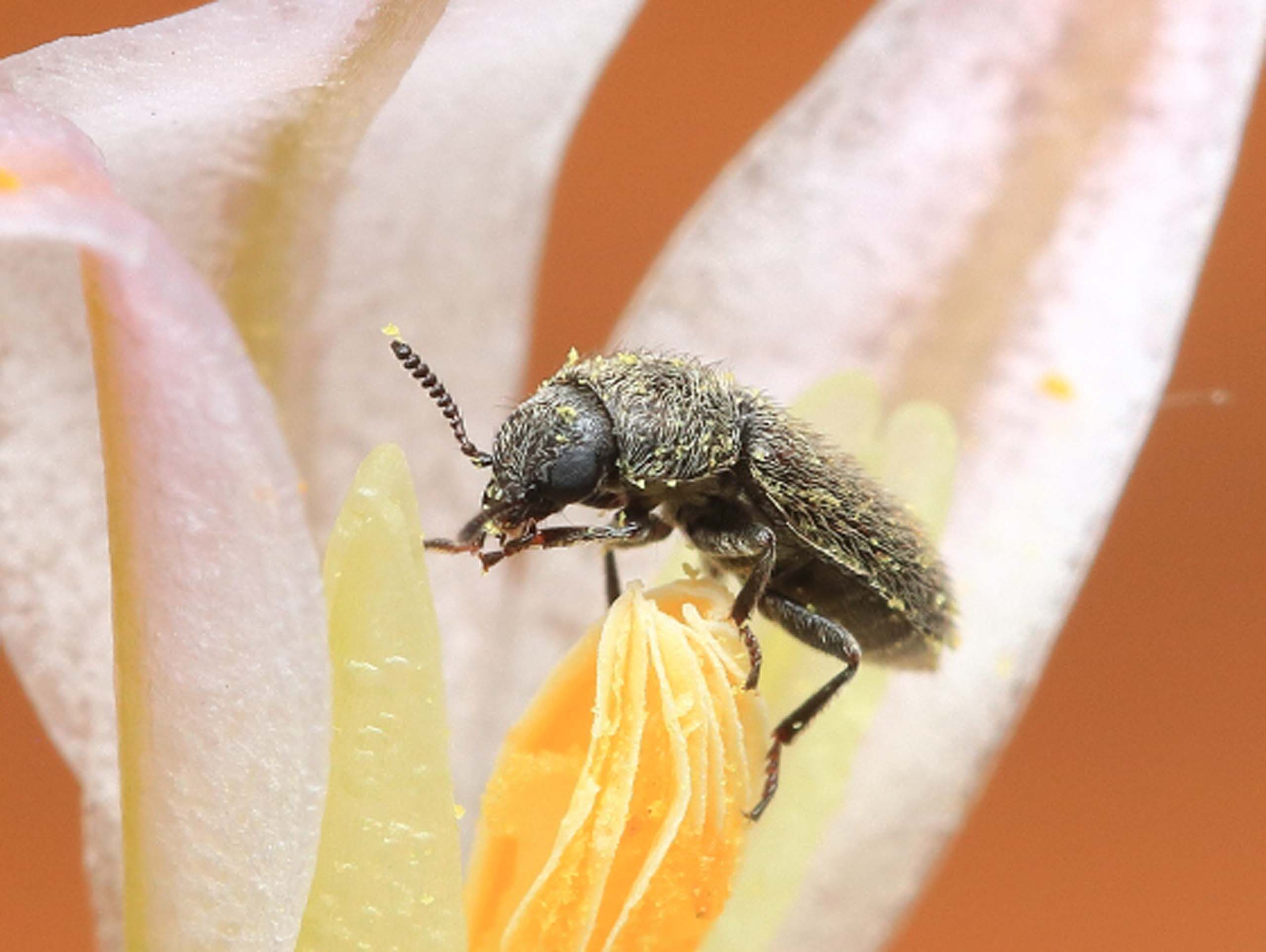 The beetle is eating pollen off of the yellow anther, the male part of the flower. Pollen grains are very high in protein and thus a desirable food for the beetle. The yellow spots on the body of the beetle are pollen grains and, if any should rub off on the stigma (the female flower part) as the beetle crawls over the flower, pollination would take place.
