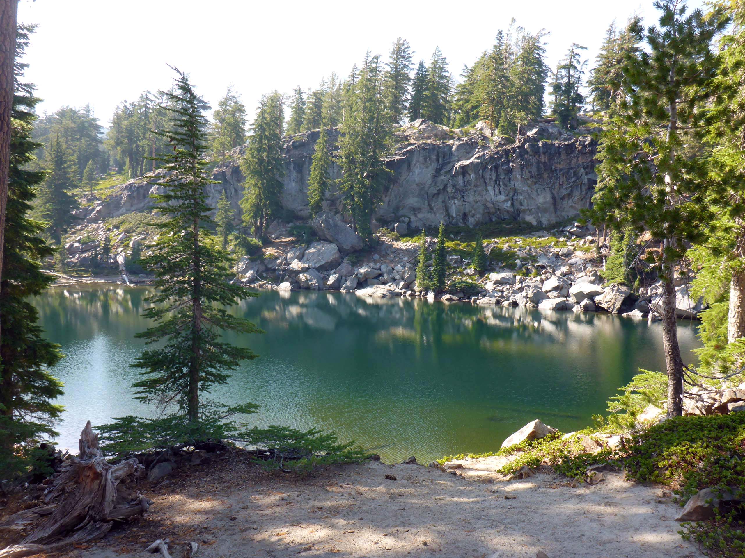 Within ~1.8 miles, on good trail through mostly open hemlock forest, you’ll see three very pretty volcanic lakes. First to come into view is our favorite and the smallest of the three: Terrace Lake.