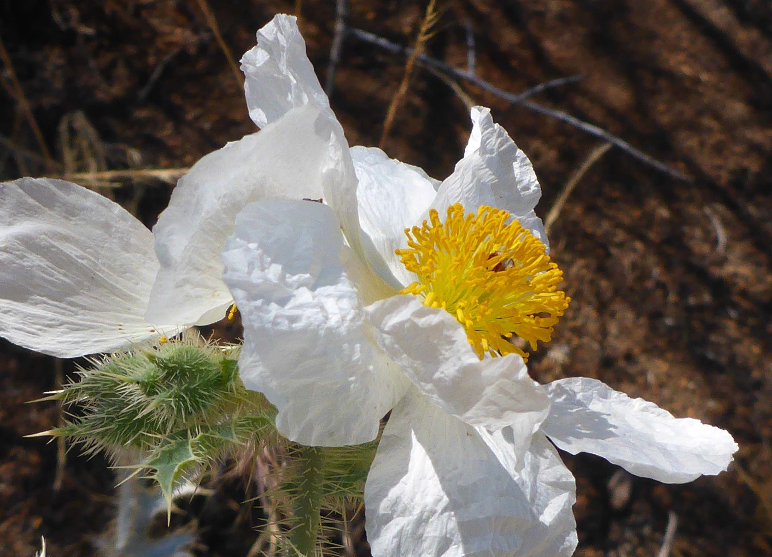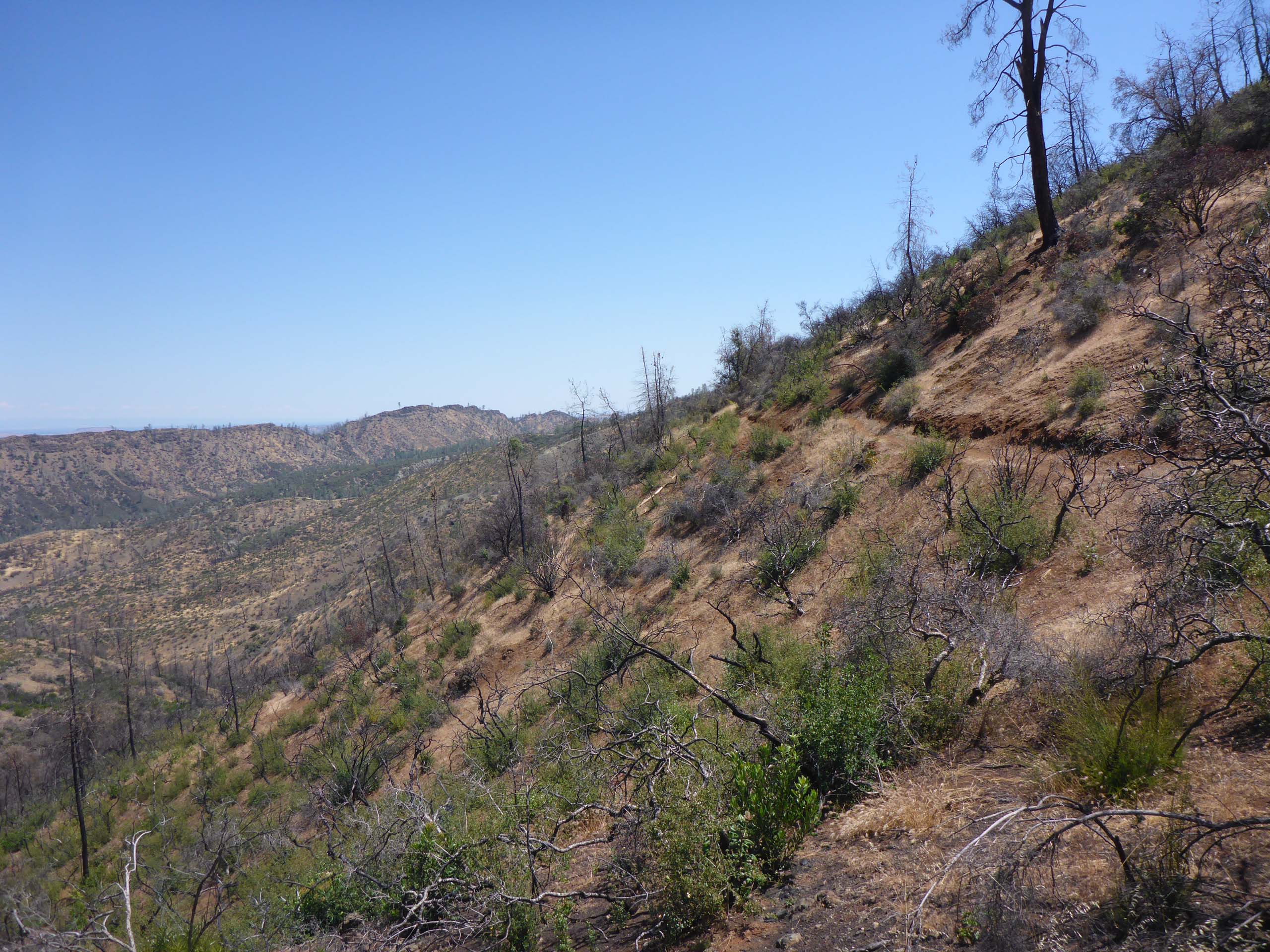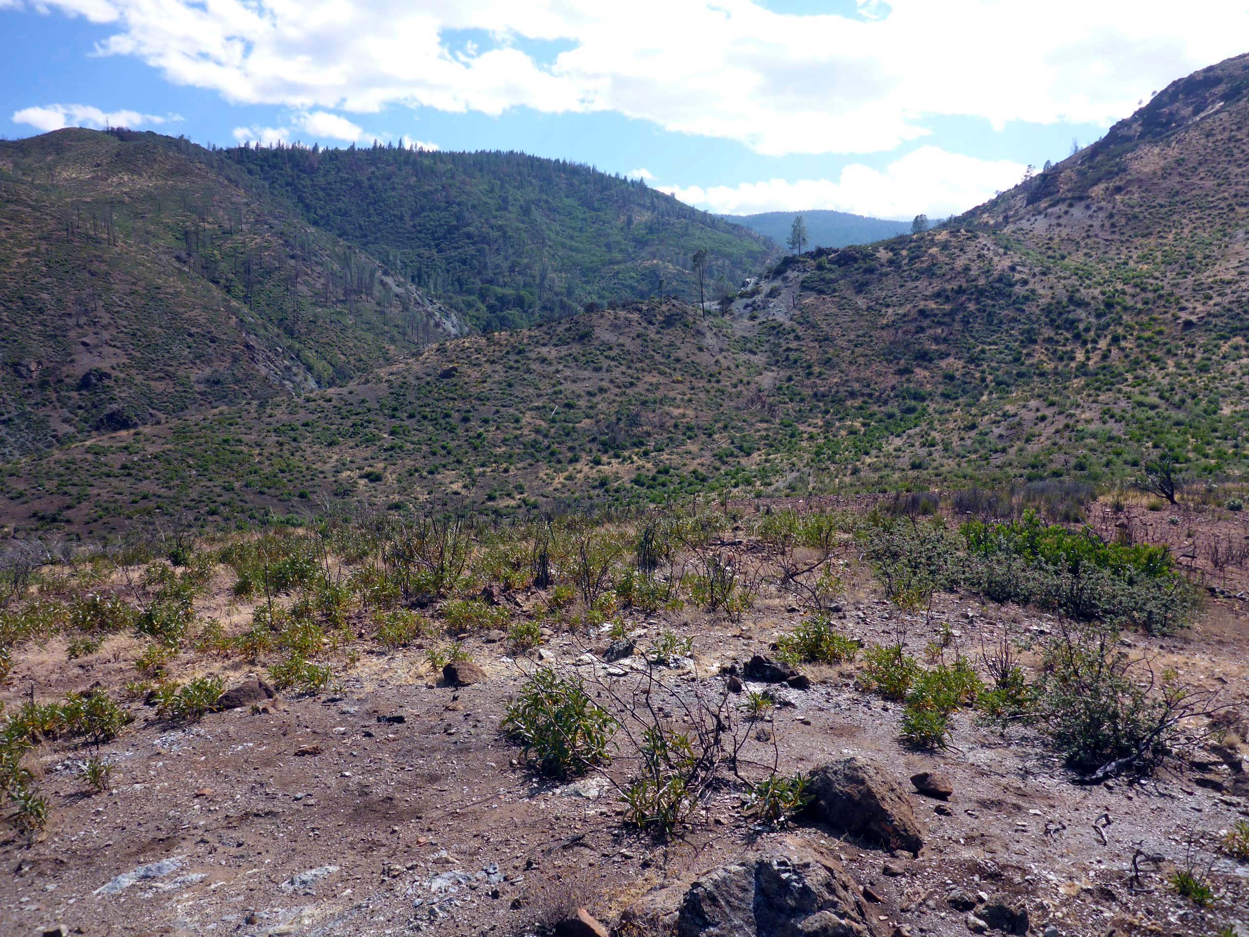 The number of flowering plants was quite reduced compared with our May hike, but we did get to see some later-blooming species that we’d missed last hike. Now that it’s been two growing seasons since the August Complex Fire came through, it was very interesting to see how much and what vegetation had grown back. Relatively close to the trailhead, there is a section that is now thick with very healthy young California bay and bee plants. The prickly poppy that seemed restricted to one hillside last year has at least doubled its coverage, and western spicebush was going gangbusters, blooming in every available drainage.