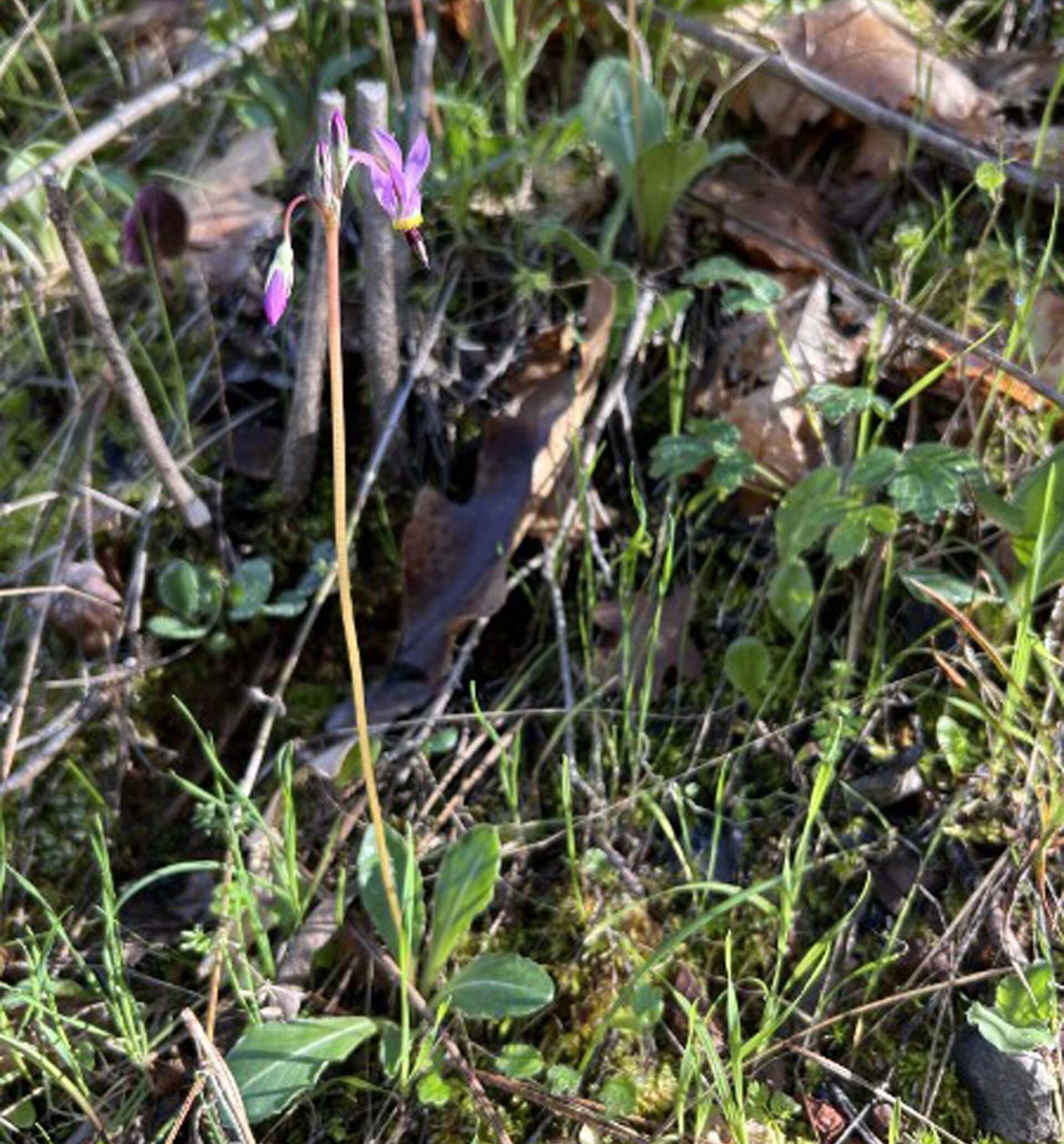 Like Jeremey, I’ve been waiting eagerly for the shooting-stars to begin their bloom. They bloom longer than the here-and-gone milkmaids, but they can be missed, too, because they also reach their peak well before most people expect. Shooting-stars are in beautiful bloom right now. Here is the first one I encountered, on February 13, a sweet note for Valentine’s Day.