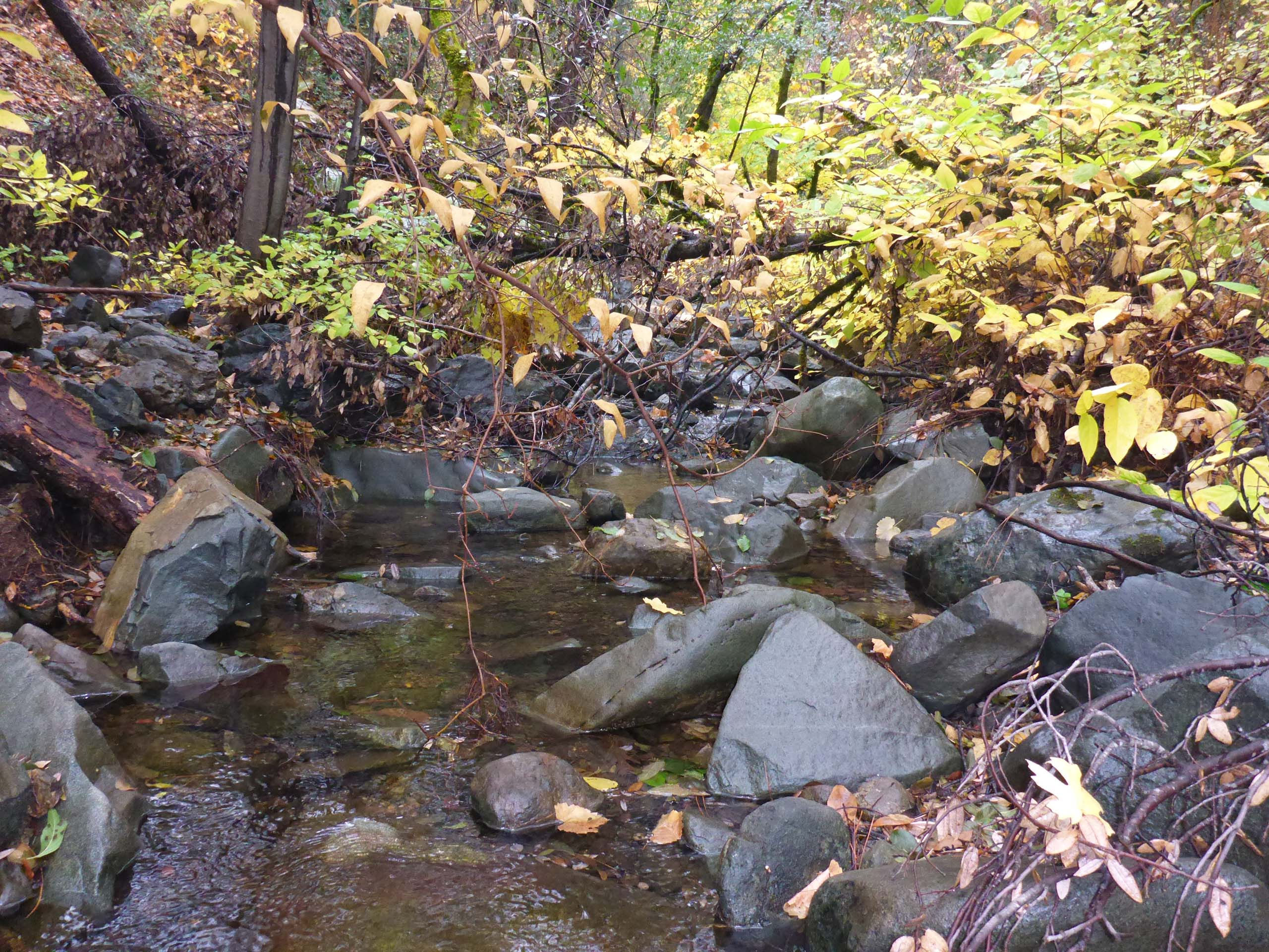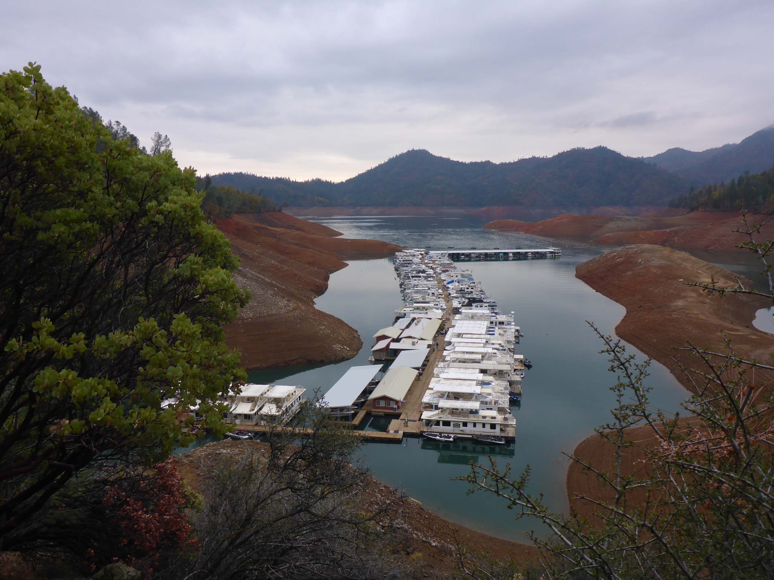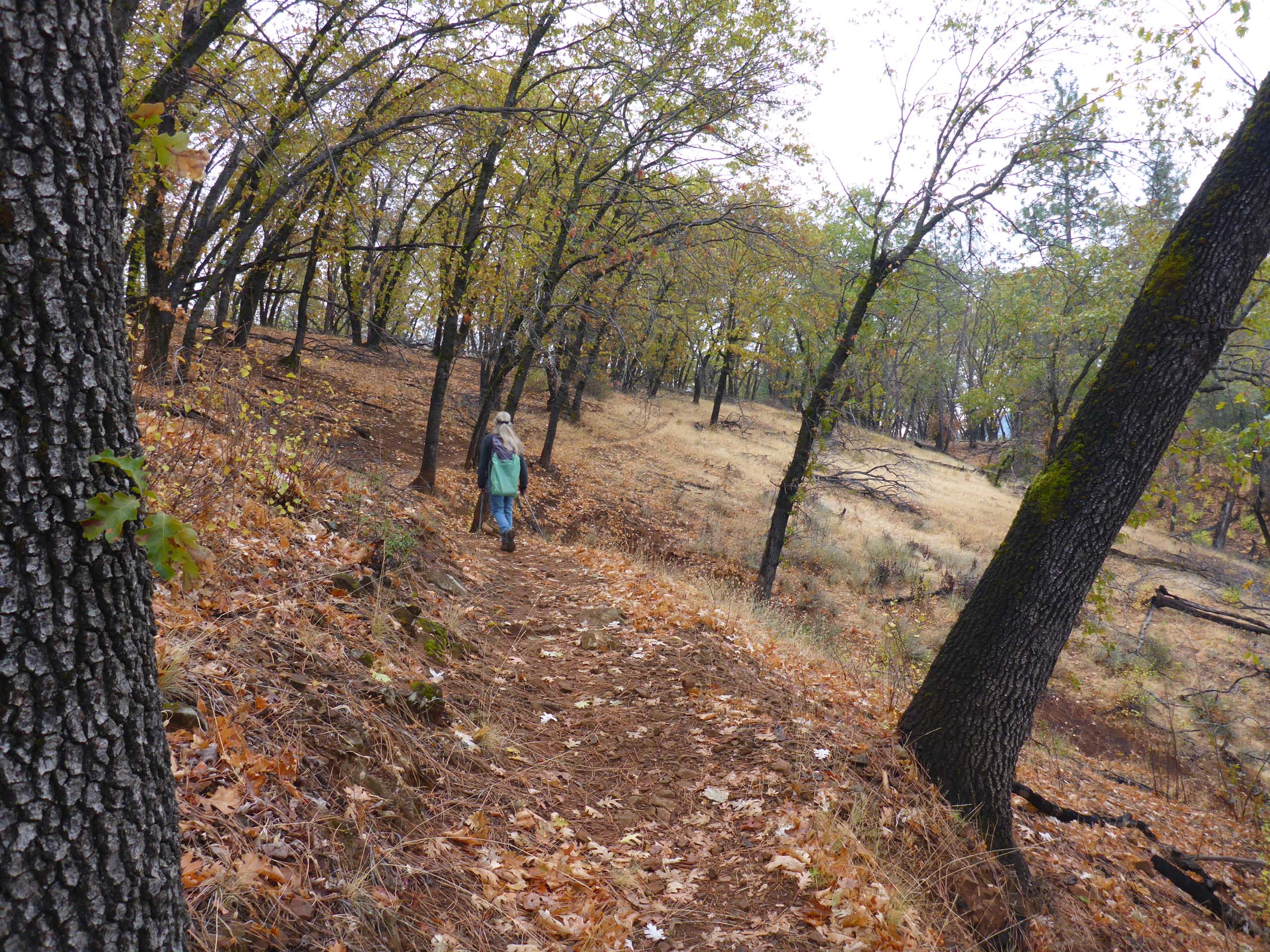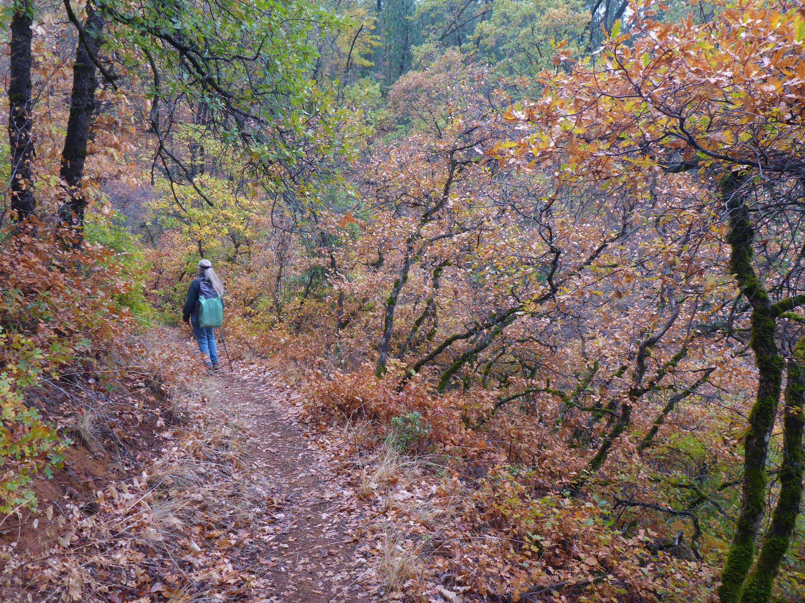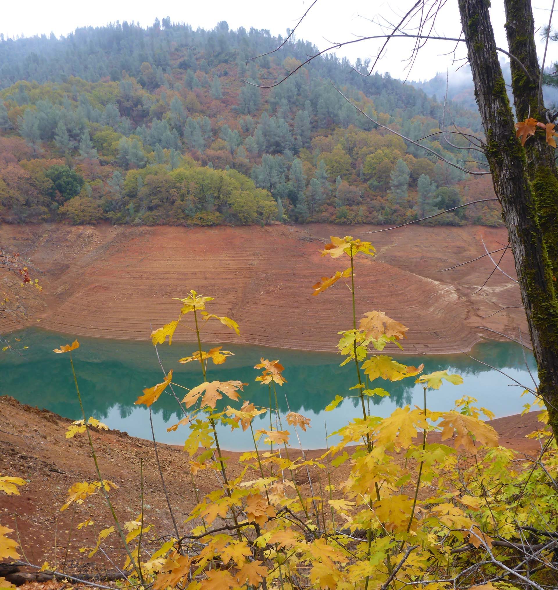 We like to walk this trail at Lake Shasta each year to see fall colors, and this cloudy, misty Sunday afternoon’s hike did not disappoint. Bigleaf maple, black oak, poison oak, Brewer’s oak, redbud, honeysuckle, and many other species were putting on a vibrant autumn show.