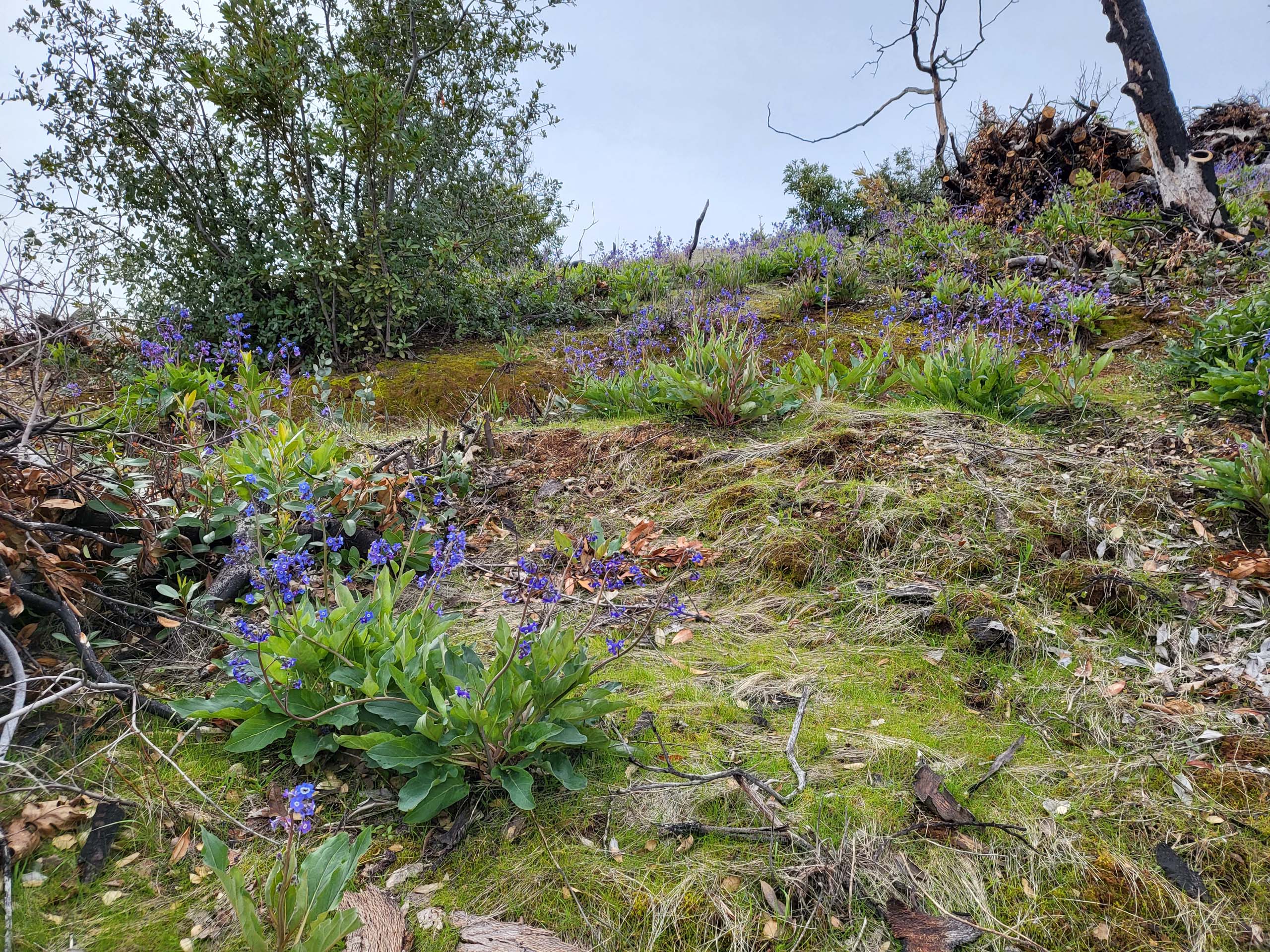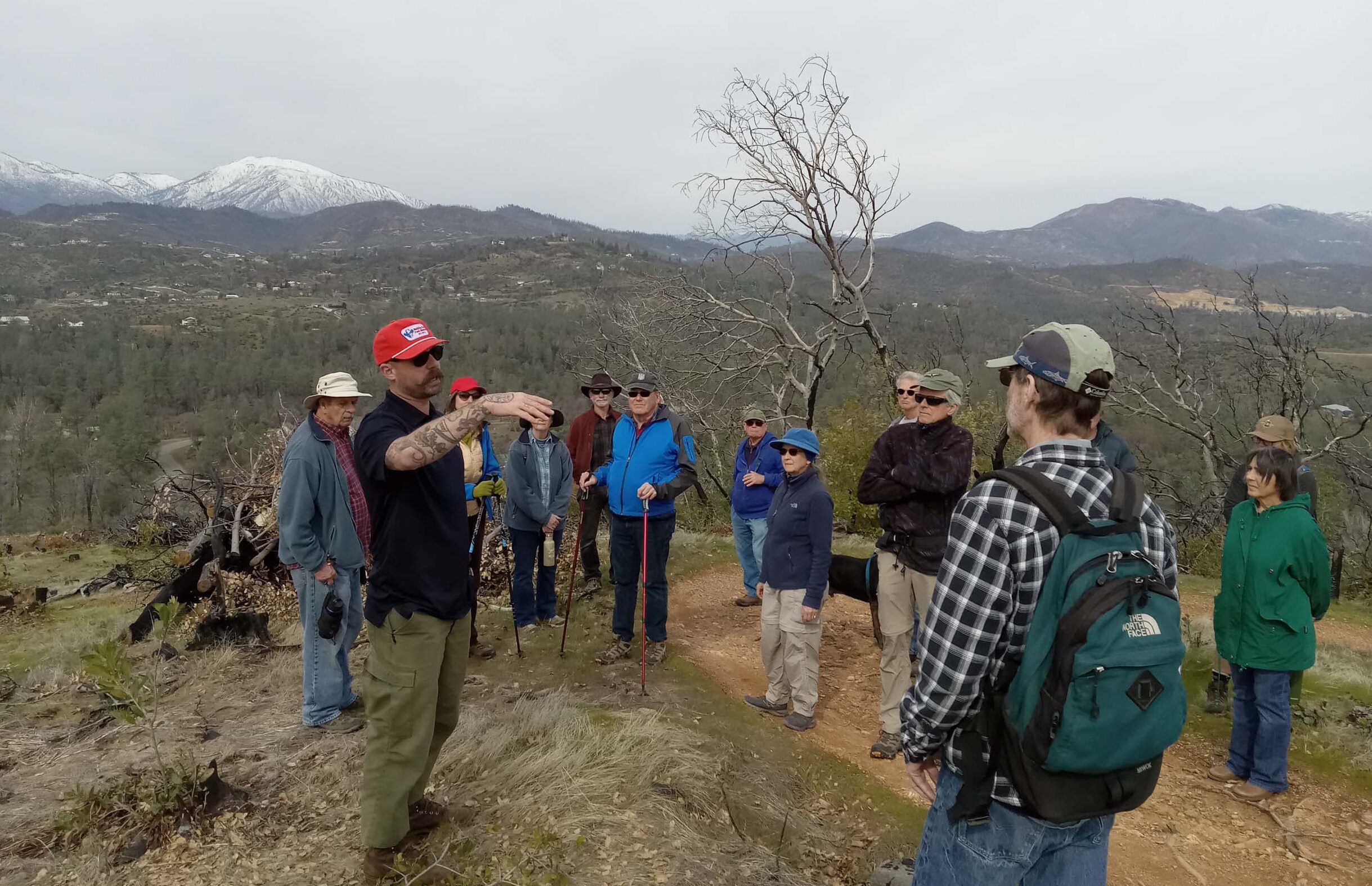 The joint Shasta Chapter CNPS/Shasta Environmental Alliance field trip to learn about Carr Fire treatment methods on the Westside Trail Complex finally took place Saturday, March 18; snow had cancelled the originally scheduled field trip. Over 20 people attended. Originally, three professionals were going to lead this field trip: two Bureau of Land Management Ecologists and one Fire Management Officer. However, the two ecologists were unable to attend due to illness, so Fire Management Officer Greg Dunn led the walk and discussion on his own.